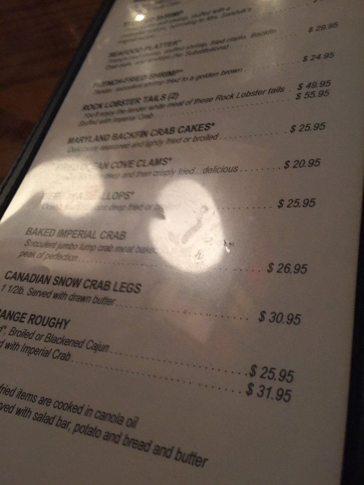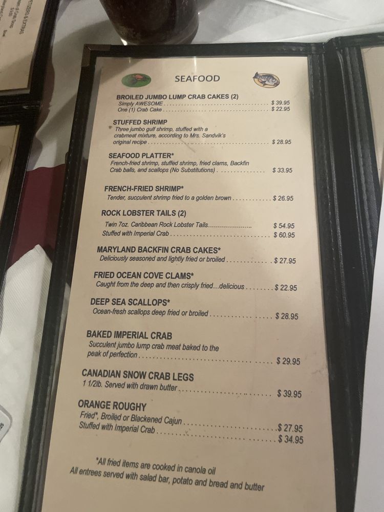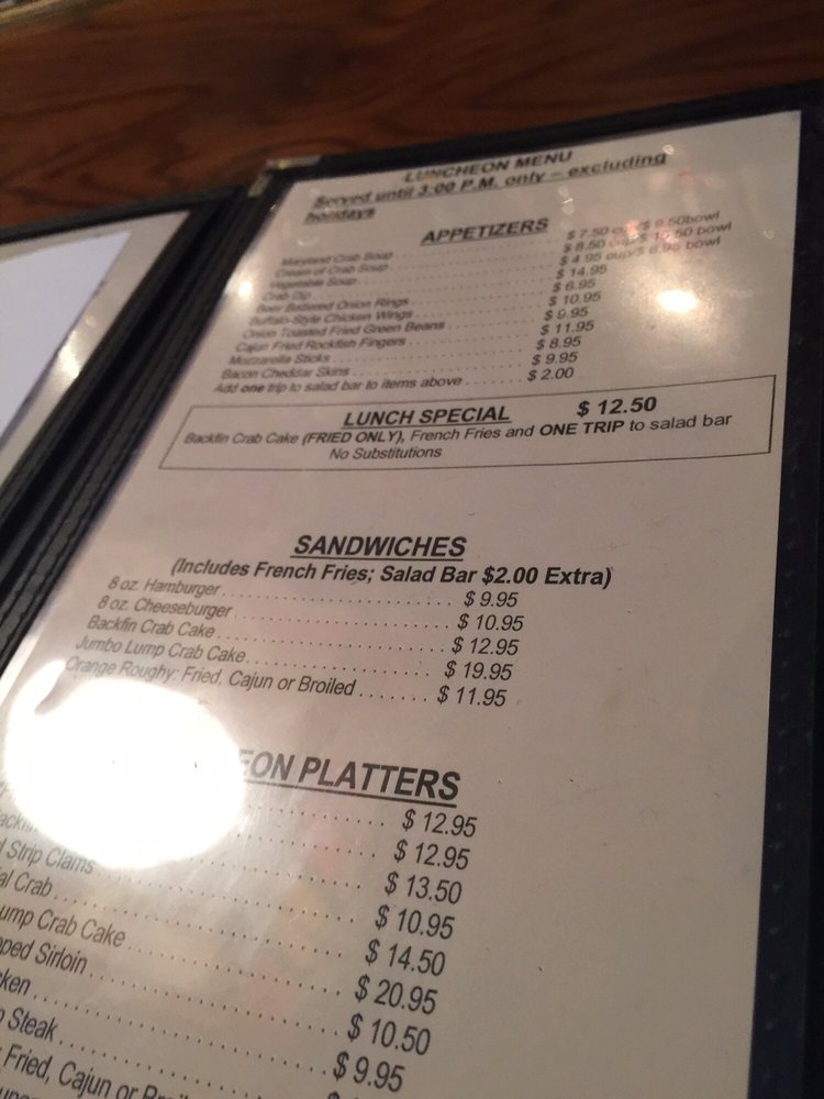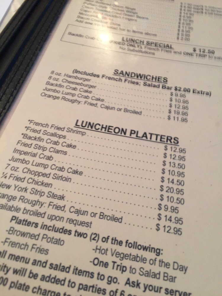 Backfin crab cake (fried only), french fries and one trip to salad bar no substitutions